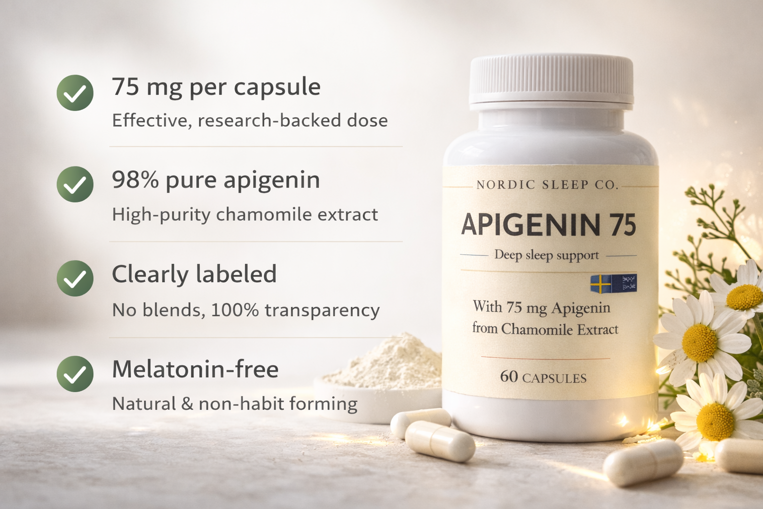 APIGENIN 75 is produced in small controlled batches in Sweden with clearly labeled ingredients and no proprietary blends.